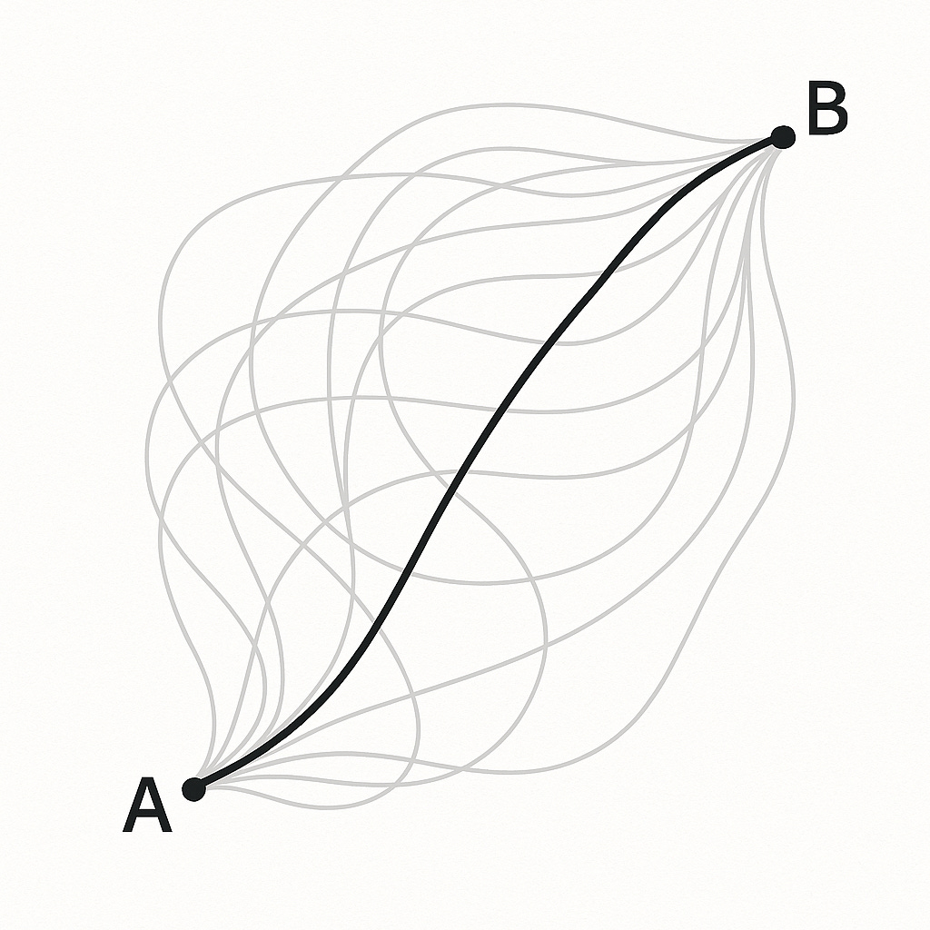 This theme recurs throughout physics. In optics, a photon bends through glass along the path that takes the least time—a principle known as Fermat’s Principle. In general relativity, gravity curves spacetime, and objects follow geodesics—the straightest possible paths in that curved geometry. In quantum mechanics, as reformulated by Feynman, a particle doesn’t take a single path—it takes all possible paths at once. Each path contributes with a phase determined by its action, and through interference, some paths cancel while others reinforce. What emerges is not a chosen trajectory, but a distribution shaped by coherence.