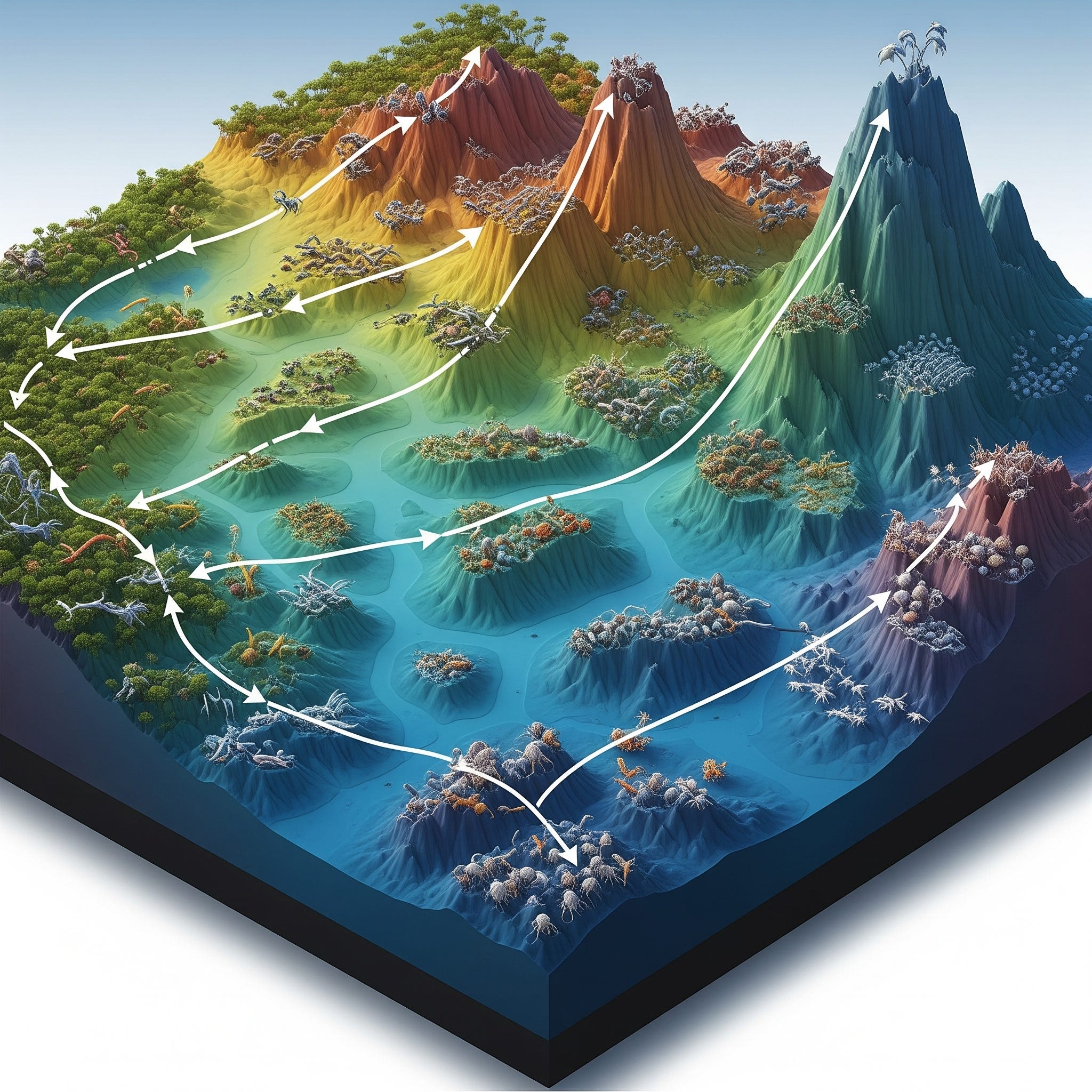 Figure 2. Visualizing evolution's “search” process: Organisms, like those shown on this fitness landscape, gradually adapt and move across generations towards optimal survival under environmental pressures.